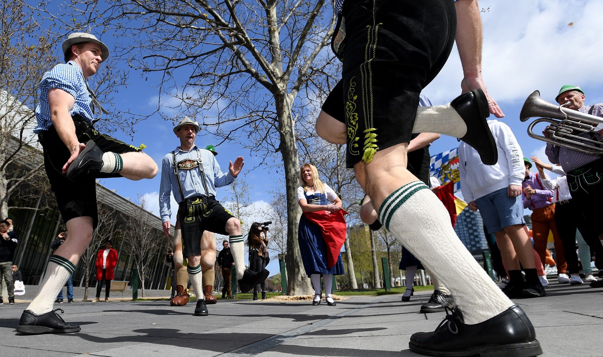 Männer und Frauen in Trachten tanzen am 16.09.2017 bei der Oktoberfest-Straßenparade in Melbourne (Australien) Schuhplattler. Bis zu 50 Teilnehmer zeigten angeblich “typisch” bayrische Oktoberfest-Bräuche. Foto: Joe Castro/AAP/dpa +++(c) dpa – Bildfunk+++