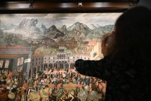 Aufgebaut ist die ganze Ausstellung um ein riesiges Gemälde. Das deckt eine gesamte Wand ab und zeigt, wie Menschen vor über 500 Jahren lebten. Weil so viele Leute darauf zu sehen sind, ist es wie ein großes Wimmelbild. „Man kann genau erkennen, was die Menschen gerade machen“, sagt Željka. „Man kann sich auch selber ausdenken, was die vielleicht gerade sprechen oder denken.“