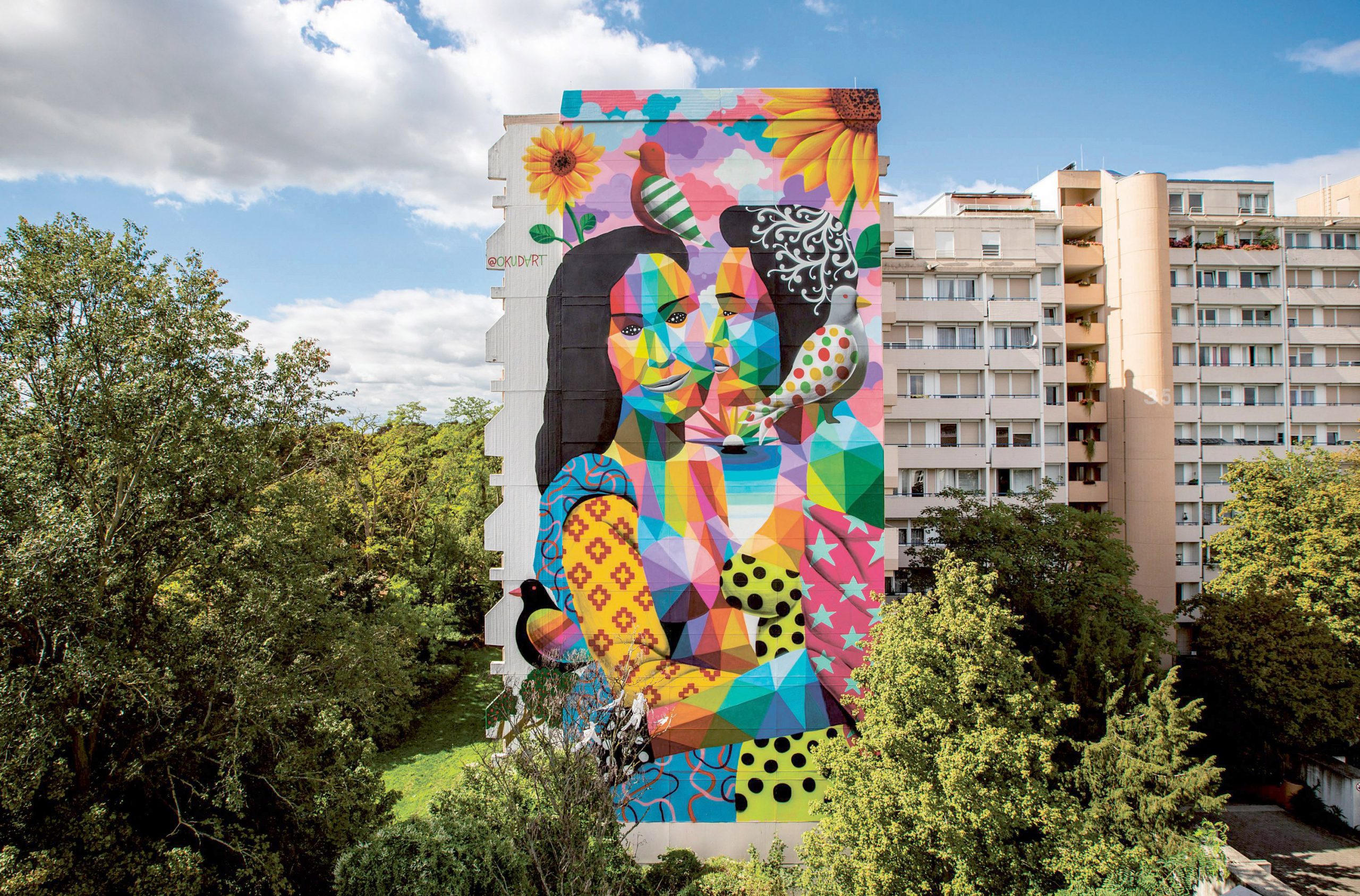 Das haushohe farbenfrohe Wandgemälde ist ein echter Hingucker. Foto: Alexander Krziwanie/Stadt.Wand.Kunst/dpa