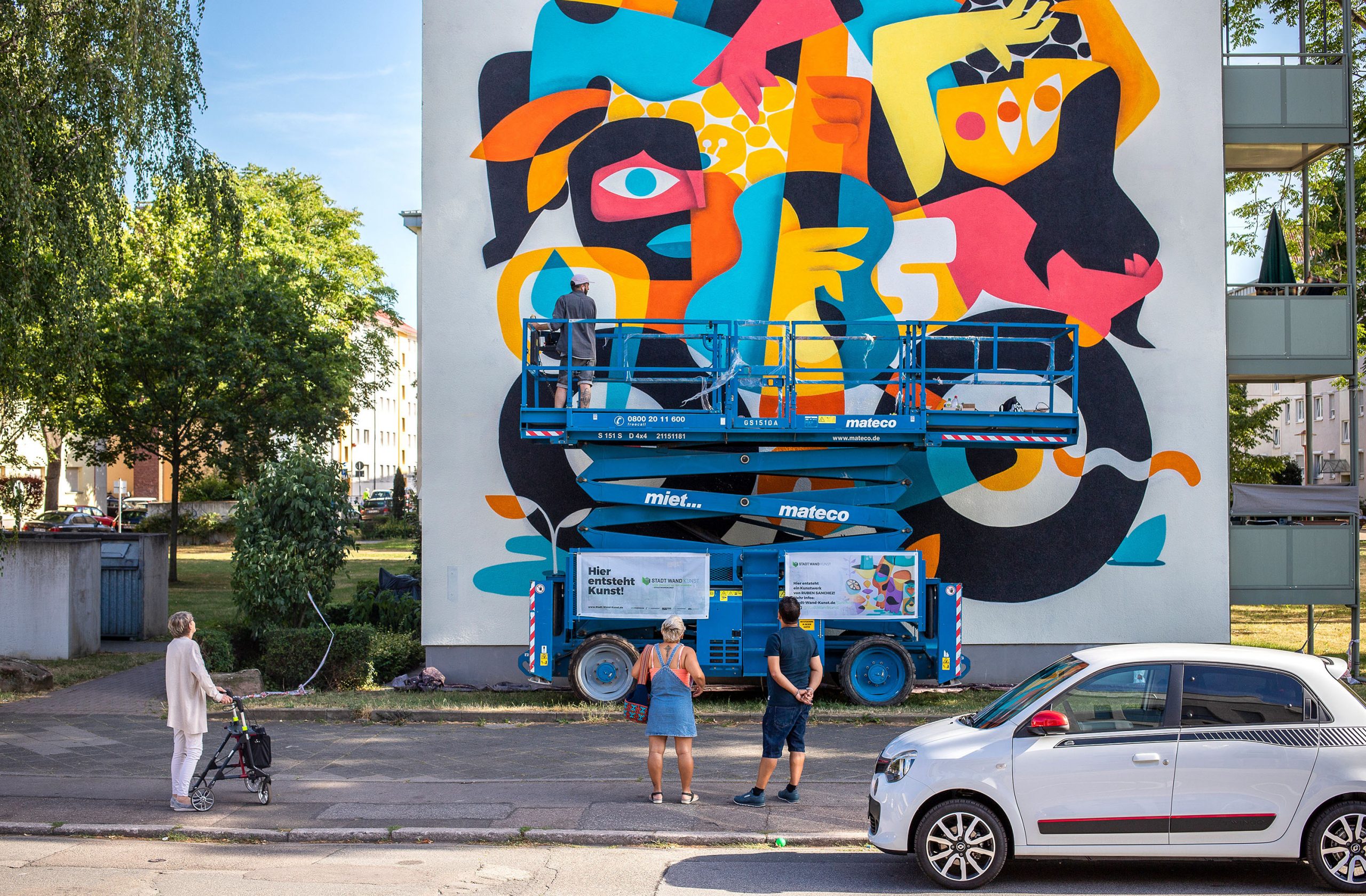 Um solch ein riesiges Wandgemälde malen zu können, braucht der Künstler eine Hebebühne. Foto: Alexander Krziwanie/Stadt.Wand.Kunst/dpa