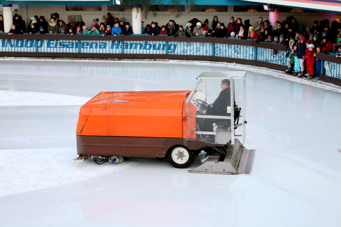 Das Bild vom 29.12.2014 zeigt einen Eishobel auf der Eisbahn der Indoor Eisarena in Hamburg. Die Maschine spült auch viel Wasser auf die Eisbahn. Foto: Silke Fokken ACHTUNG: Honorarfrei nur für Bezieher des Dienstes dpa-Nachrichten für Kinder +++(c) dpa – Nachrichten für Kinder+++