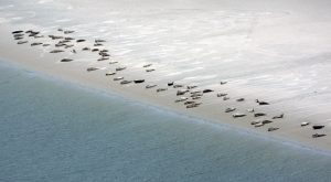 Sind das große, graue Steine dort unten? Aus der Luft sehen die Seehunde so aus. Bei niedrigem Wasser liegen die Tiere am Strand oder auf Sandbänken an der Nordsee-Küste. Dann kann man sie gut zählen, besonders aus der Luft.