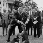 - 1964, Präsident Lyndon B. Johnson hält seinen Hund “Her” an den Ohren, daneben sitzt Johnsons zweiter Hund, “Him“. Foto: Charles P. Gorry/AP/dpa