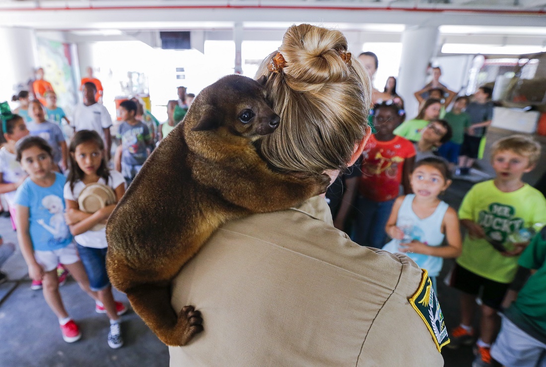 Er streift also durch die Wipfel. Geschickt klettert er von Ast zu Ast. Seinen langen, kräftigen Schwanz wickelt er beim Klettern mal hier, mal da um die Äste. Jetzt weißt du auch, warum das Tier Wickelbär heißt! „Das ist so ein Greifschwanz”, sagt Herr Grüßer. „Den benutzt er sozusagen wie einen fünften Arm.”