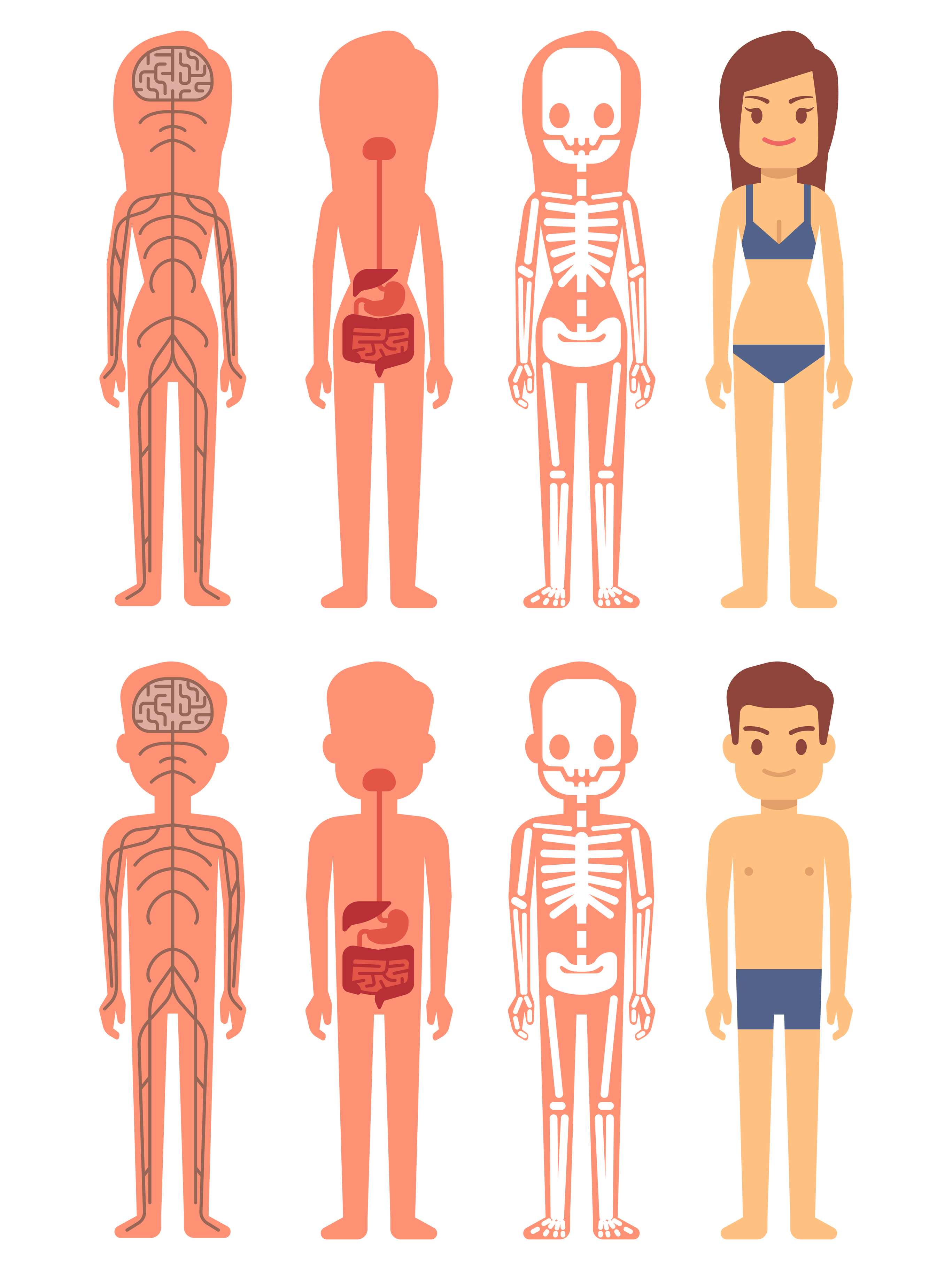 Male and female skeleton, digestive and nervous systems