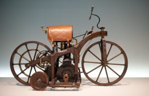 Gottlieb Daimler wünschte sich Motoren „zu Lande, zu Wasser und in der Luft“. Zuerst baute er seine Erfindung in einen sogenannten Reitwagen ein. Den kann man sich wie eine Art Holzfahrrad mit Motor vorstellen – also quasi das erste Motorrad. Später wurde der Motor in ein Boot eingebaut, in ein Luftschiff und in eine Kutsche. Aus diesen motorisierten Kutschen wurden später Autos, wie wir sie heute kennen.