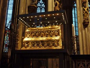 1157 nach Christus sollen die Überreste der Heiligen Drei Könige in Mailand in Italien gefunden worden sein. Ob sie es wirklich sind, ist nicht sicher. Wo sie bis dahin waren, ist auch nicht bekannt. Wenige Jahre später wurden die Knochen dann vom Kölner Erzbischof nach Köln gebracht. Weil die Überreste, die man Reliquien nennt, so bedeutsam sind, wurde extra ein Schrein dafür gebaut. Ein Schrein ist ein großer verzierter Kasten. Weil vielen Christen die Heiligen wichtig sind, fahren sie extra nach Köln, um den Schrein zu sehen.