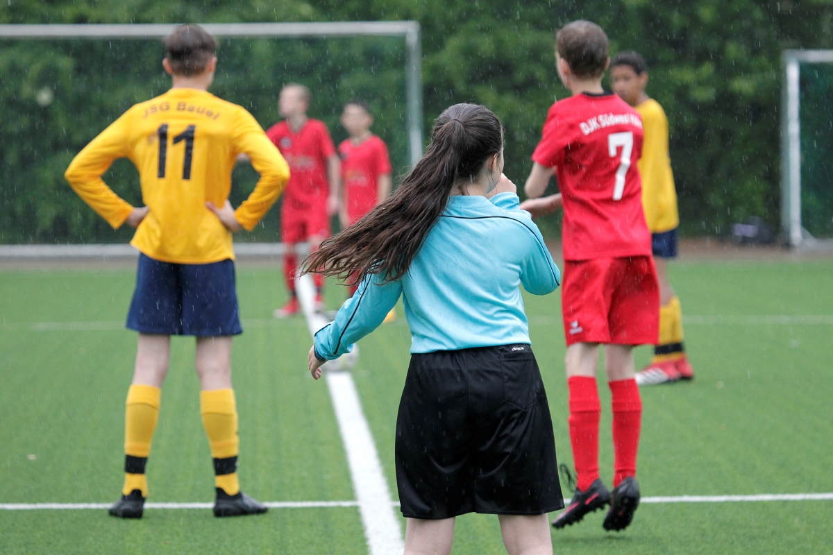 Lenja flitzt mit den Spielern über den Platz, weicht dem Ball aus, beobachtet das Verhalten der Mannschaften. Und plötzlich ertönt ihre Pfeife: Tor für Beuel! Jubel von der Seitenlinie, an der Trainer und Eltern stehen. Doch nicht nur sechs Tore – das Spiel endet 3:3 – kann Lenja heute auf ihrer Schiedsrichterkarte notieren: Auch einige Fouls und Auswechslungen muss sie festhalten.