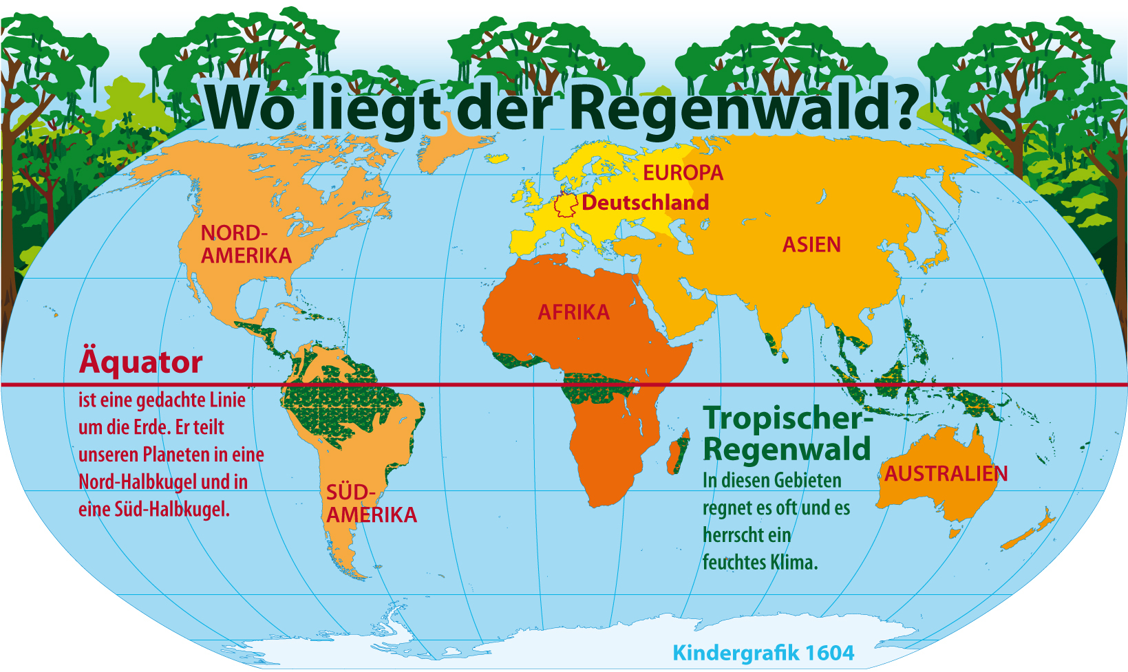 Tropenwälder sind Wälder entlang des Äquators. Den kannst du dir vorstellen wie ein Band, das die Erde an ihrer breitesten Stelle umspannt. Er zieht sich unter anderem durch Länder in Afrika, Südamerika und durch Indonesien. Rund um den Äquator sind die Temperaturen fast immer gleich – sehr warm. Es hängt von der Menge des Regens ab, wie und wann die Wälder wachsen.