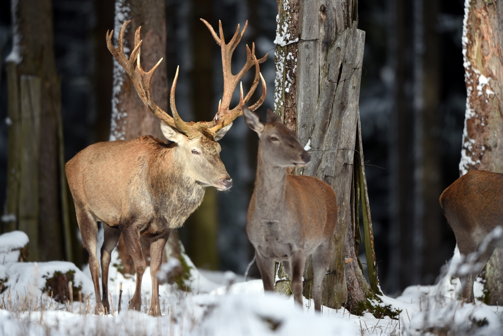 - Aussehen: Rothirsche sind die größten Wildtiere Europas. Sie sind etwa zwei Meter lang, mehr als einen Meter hoch und wiegen bis zu 300 Kilogramm. Die Männchen haben ein sieben Kilo schweres Geweih. Einmal im Jahr verlieren sie es. Je älter die Tiere sind, desto größer ist es. Im Sommer ist das Fell rot, im Winter grau, die Kälber sind getupft.