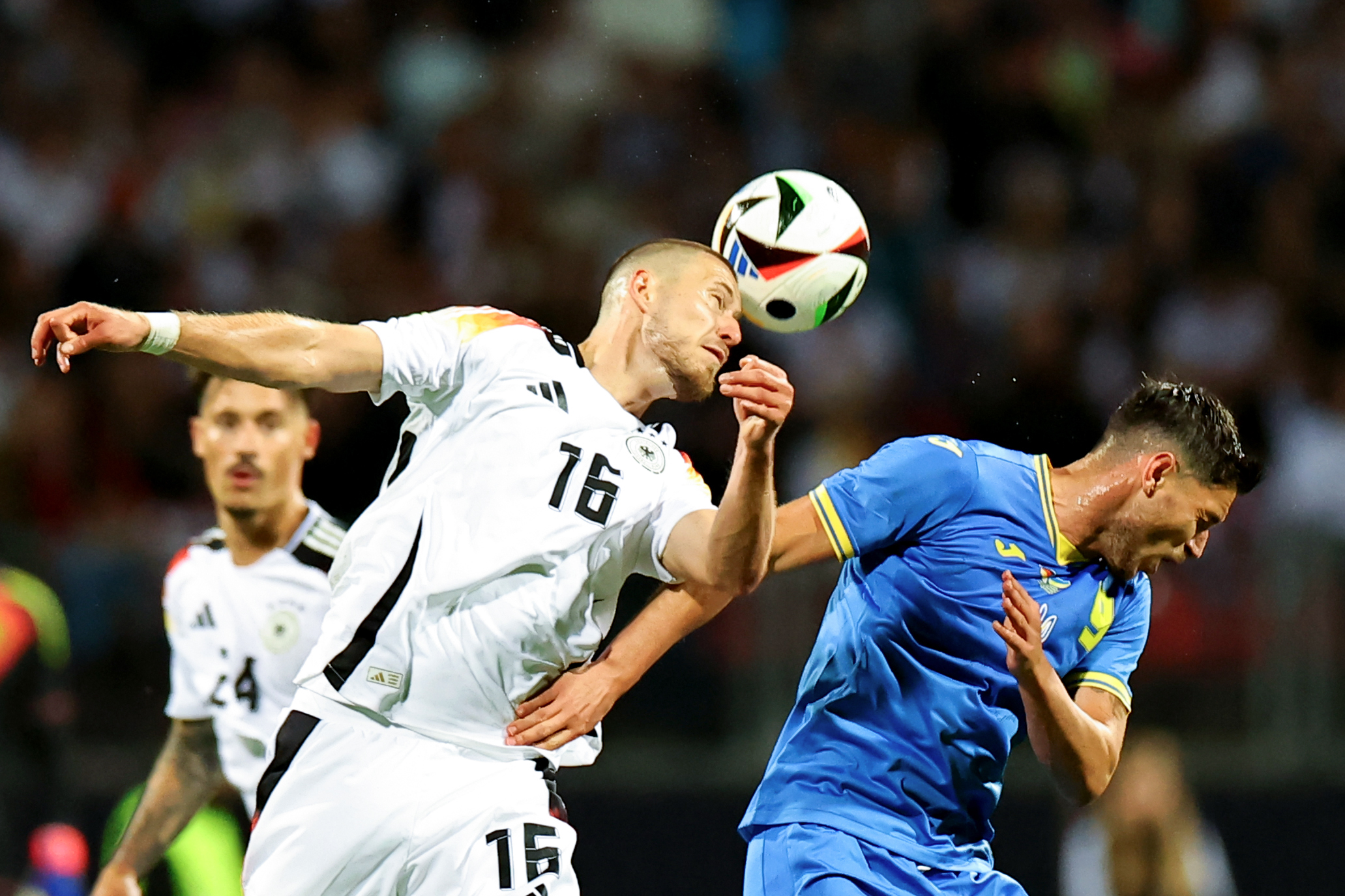 Der deutsche Nationaspieler Waldemar Anton setzt sich gegen seinen Gegenspieler durch und kommt mit dem Kopf an den Ball. Foto: Daniel Karmann/dpa