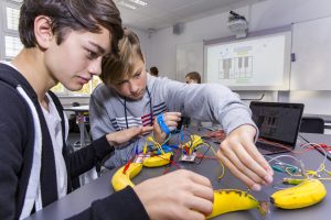 Zwei Schüler testen das Modul MocoMoco – Mithilfe des mitgelieferten Micro-Controllers können in Sekundenschnelle alle leitenden Alltagsgegenstände ganz ungefährlich als Eingabegeräte an den Computer angeschlossen werden – ob Bananen, Aluminiumfolie, Blumen oder sogar die Mitschülerinnen und Mitschüler selbst. Foto: Frank Daum/Wissensfabrik