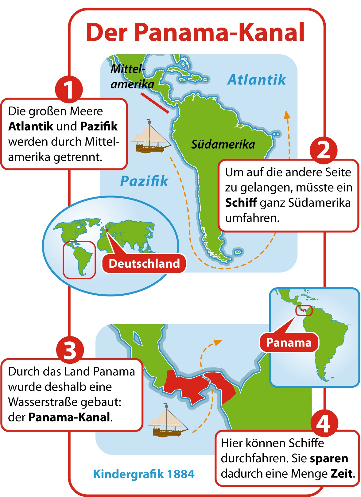 „Damit erfüllte sich ein Jahrhunderte alter Menschheits-Traum“, sagt der Geschichts-Experte Holger Meding. Denn schon seit rund 400 Jahren hatten Seeleute, Herrscher und Forscher vom Kanal durch Mittelamerika geträumt. Unter anderem um Waren besser mit Schiffen transportieren zu können. So mussten sie mit ihren Schiffen nicht mehr einen weiten Umweg um ganz Südamerika fahren, sondern konnten den Panama-Kanal als Abkürzung nutzen. Das sparte jede Menge Zeit und Geld!