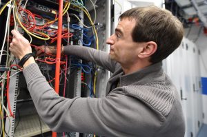 „Wir Systemadministratoren sorgen dafür, dass die Strukturen, die andere Leute täglich nutzen, reibungslos funktionieren.“ Und so wie der Hausmeister im Klassenzimmer mal die Glühbirne wechseln muss, steuert Julius Schwartkop Updates für alle Mitarbeiter der Firma, schraubt im Rechenzentrum an den großen Maschinen herum oder wird von Mitarbeitern gefragt, wenn die ein Problem haben.