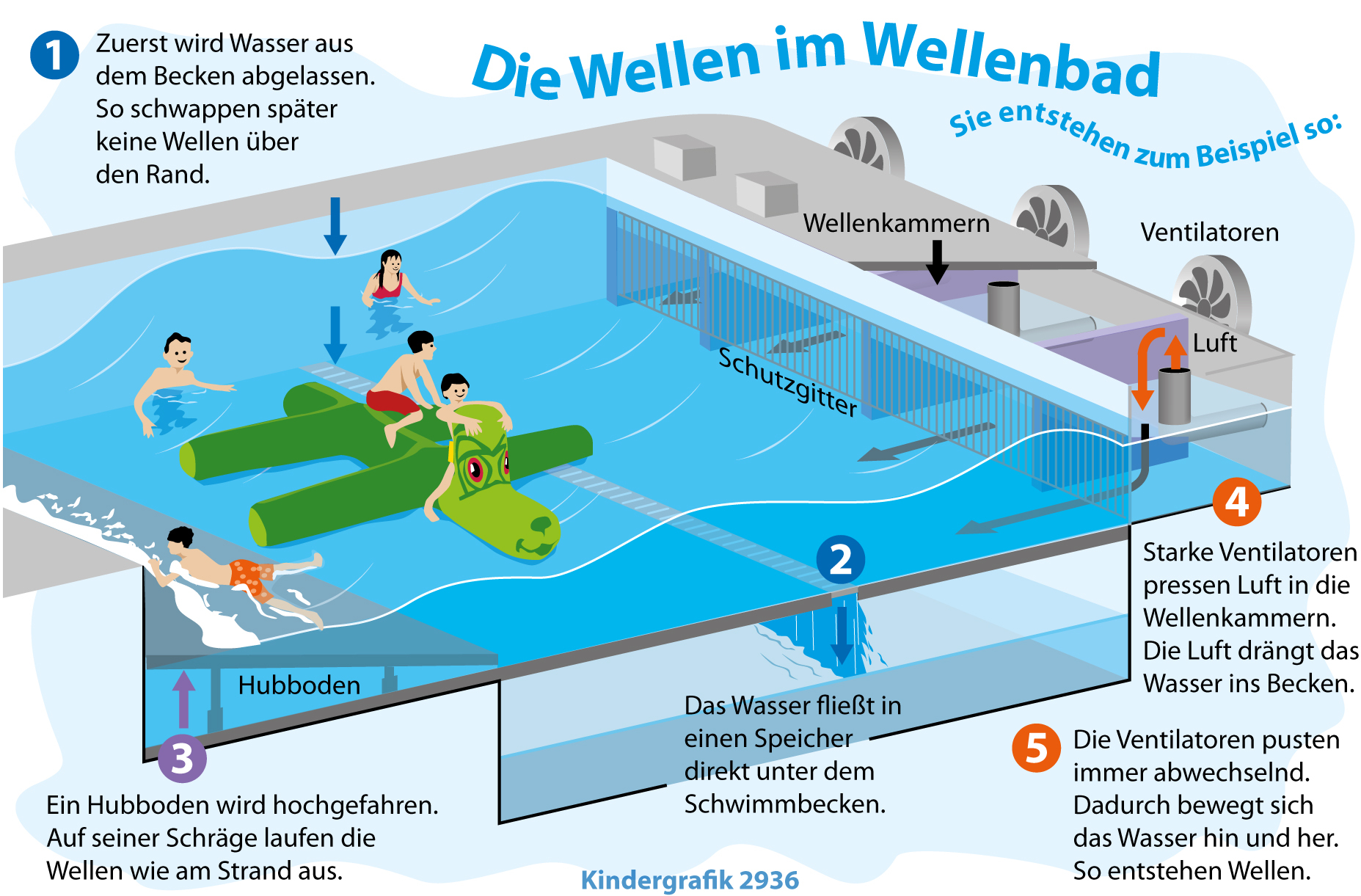 Das funktioniert zum Beispiel so: Im Hallenbad in Neuss gibt es mehrere Wellenkammern. Darin ist Wasser. Hinter den Kammern sind drei große Ventilatoren. Sie können superstark Luft herausblasen. Die Luft drückt von oben auf das Wasser in den Kammern und schiebt so das Wasser durch Gitter hinaus in das Schwimmbecken.