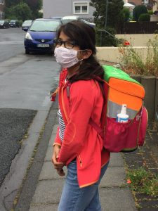 Ich war in der letzten Woche zum ersten Mal wieder in der Schule. Es war alles sehr seltsam. Wir durften nicht durch den Haupteingang gehen, sondern um das Gebäude herum durch einen Seiteneingang. Außerdem mussten wir Abstand halten und immer unsere Masken tragen – außer beim Unterricht im Klassenraum, da durften wir sie abnehmen. Als wir reingekommen sind, sollten wir unsere Sachen an den Platz stellen und dann die Hände waschen – und erst als wir uns gesetzt hatten, durften wir die Masken endlich abnehmen. Hände waschen mussten wir auch nach den Pausen.