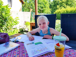Einmal in der Woche habe ich Schule, meistens am Donnerstag. Ansonsten lerne ich von zu Hause aus und arbeite an meinem Wochenplan. Wenn ich Schule habe, dann bin ich mit sieben andern Kindern in einem Klassenraum. Wir haben immer die Fenster und Türen auf und sitzen mit großem Abstand auseinander. Im Großen und Ganzen ist es ganz okay, aber es wäre echt toll, wenn alles wieder normal wäre.