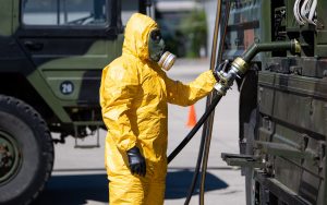 Ein Soldat stellt auf dem Gelände der Universität der Bundeswehr Desinfektionsmittel her. Foto: Sven Hoppe/dpa